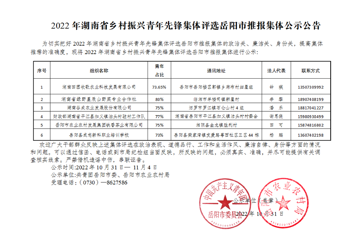 2022年湖南省乡村振兴青年先锋集体评选365bet投注网址_bat365官方登录中文_365体育app安装推报集体公示公告